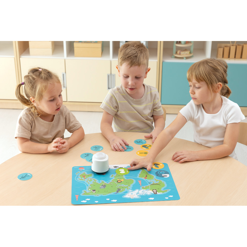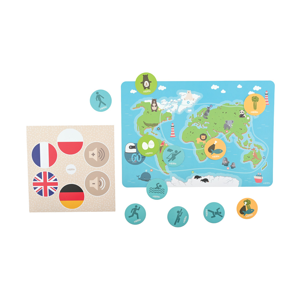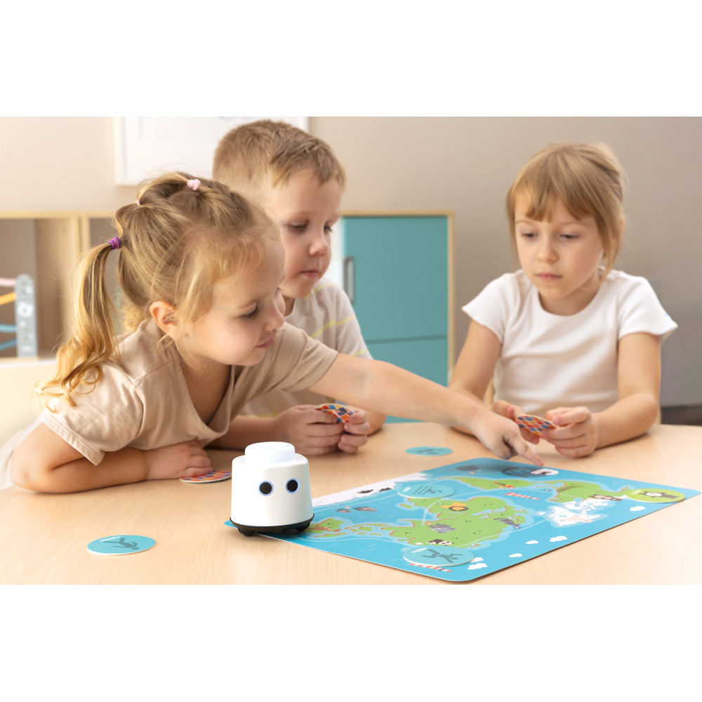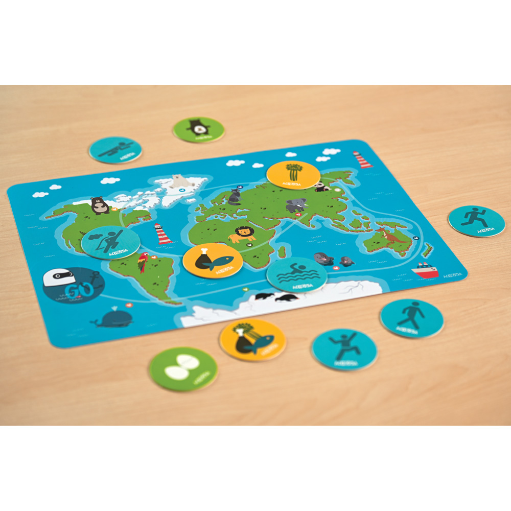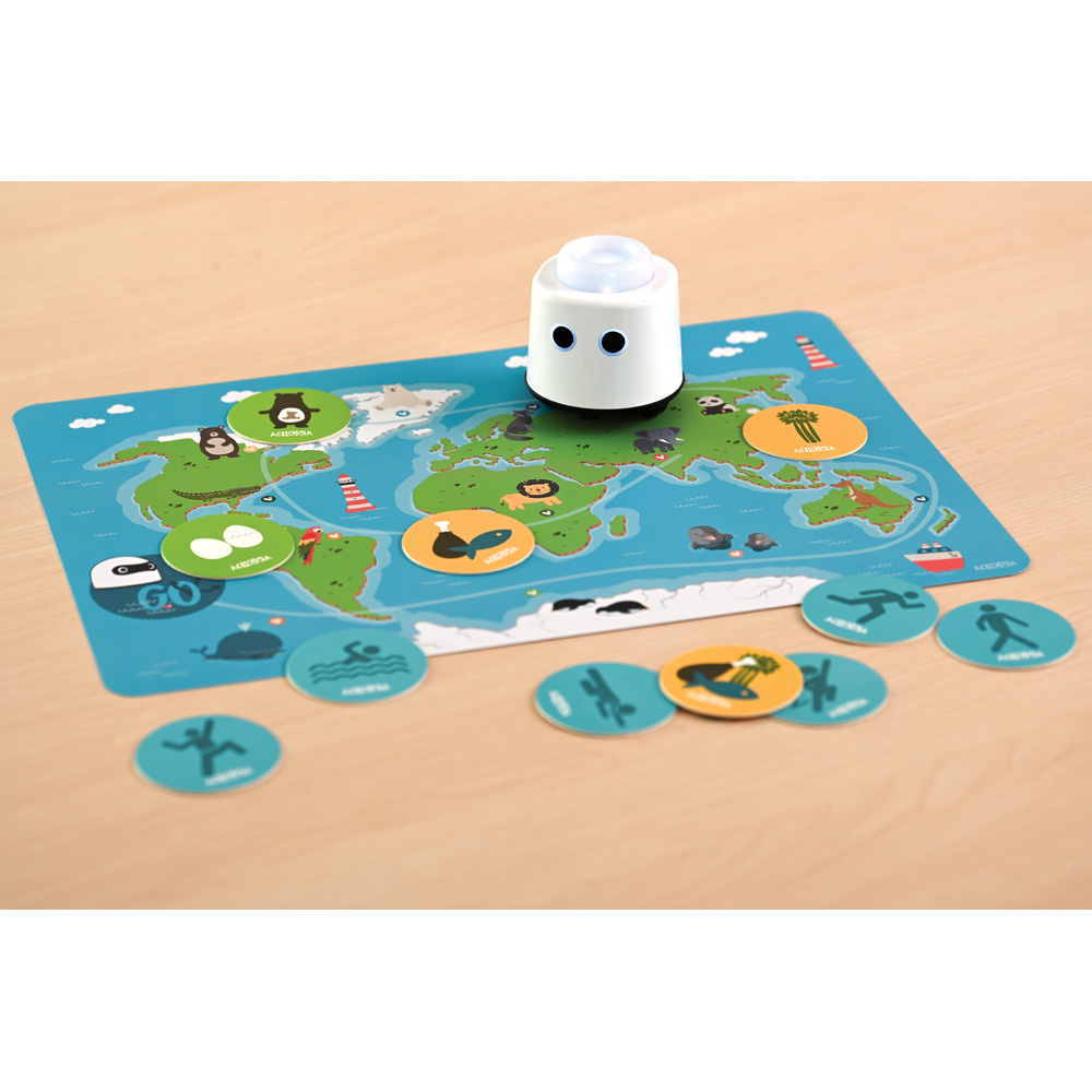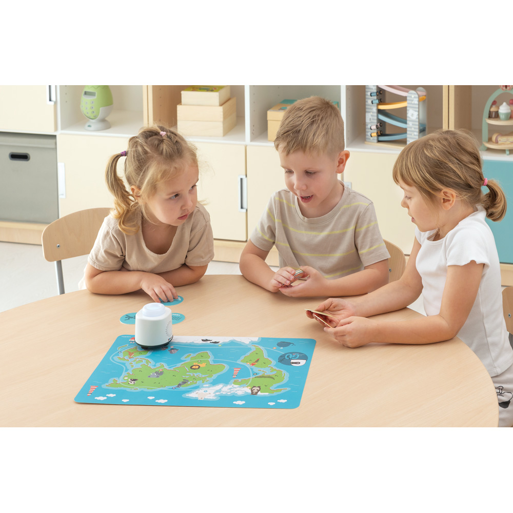 Working with LOGI miniBot – Animals of the World is based on a large, easy-to-read A3 board showing a world map and a variety of natural habitats. Using 12 animal illustration cards, children place them on the map in the correct locations, identifying continents and discussing the living conditions of different species.
