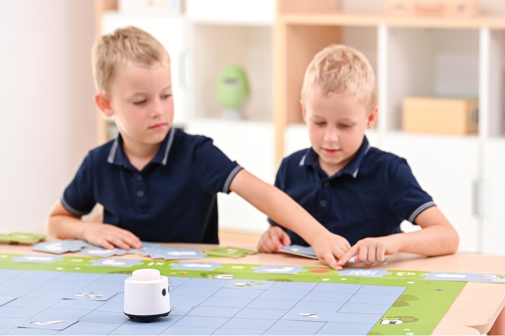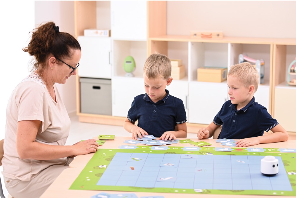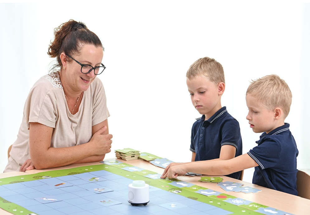 Children’s task is to arrange a sequence of movements that will guide the robot to the water lily card while avoiding obstacles on the board. Each game presents a new challenge that develops spatial awareness and planning skills.