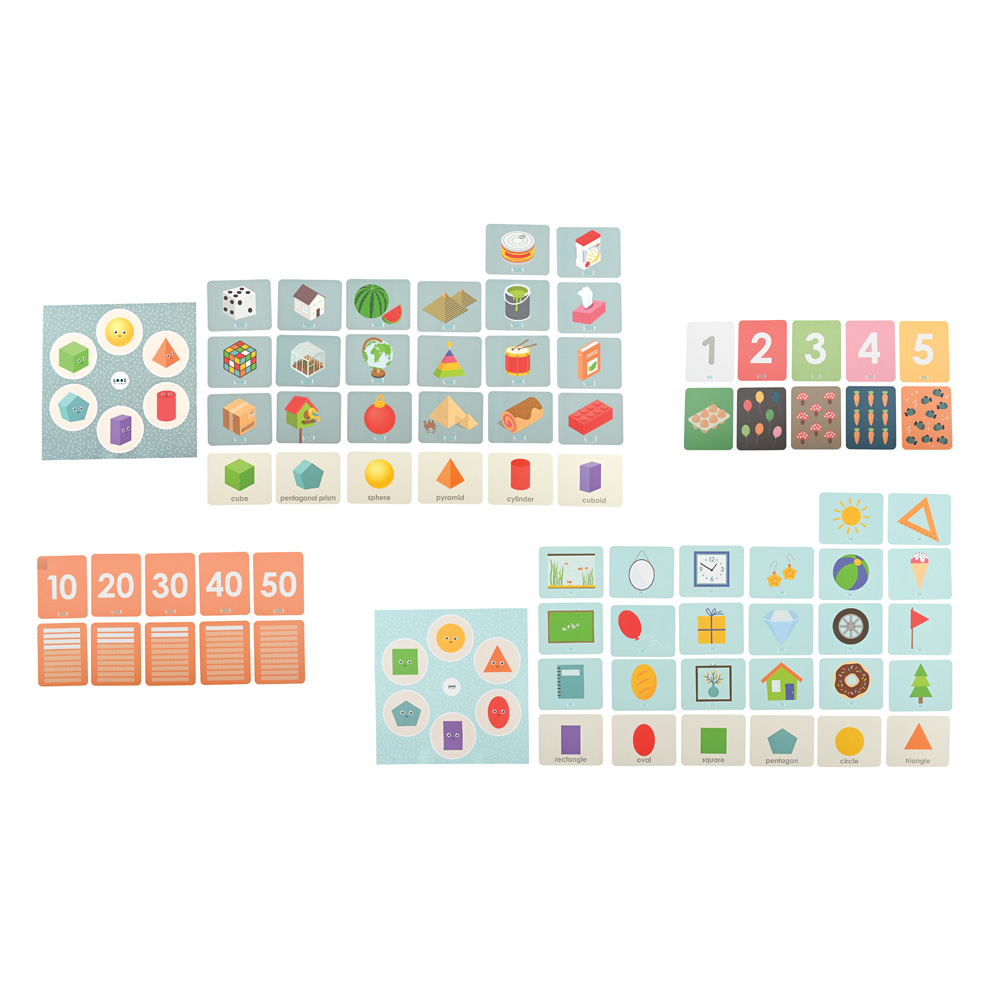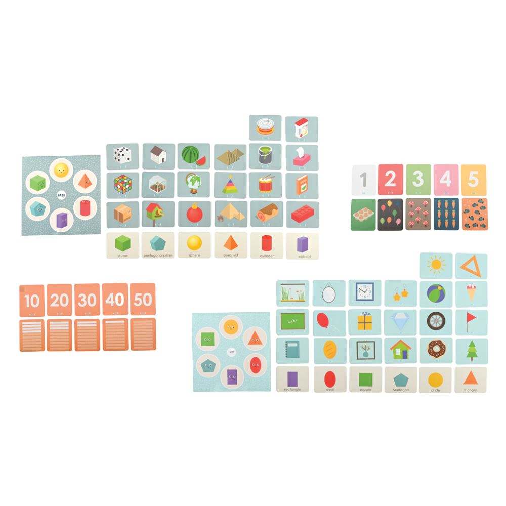 The set presents basic mathematical topics in English: from counting and digits to shapes and solids. This way, the child learns two things at once: understanding mathematics as well as English vocabulary and pronunciation.