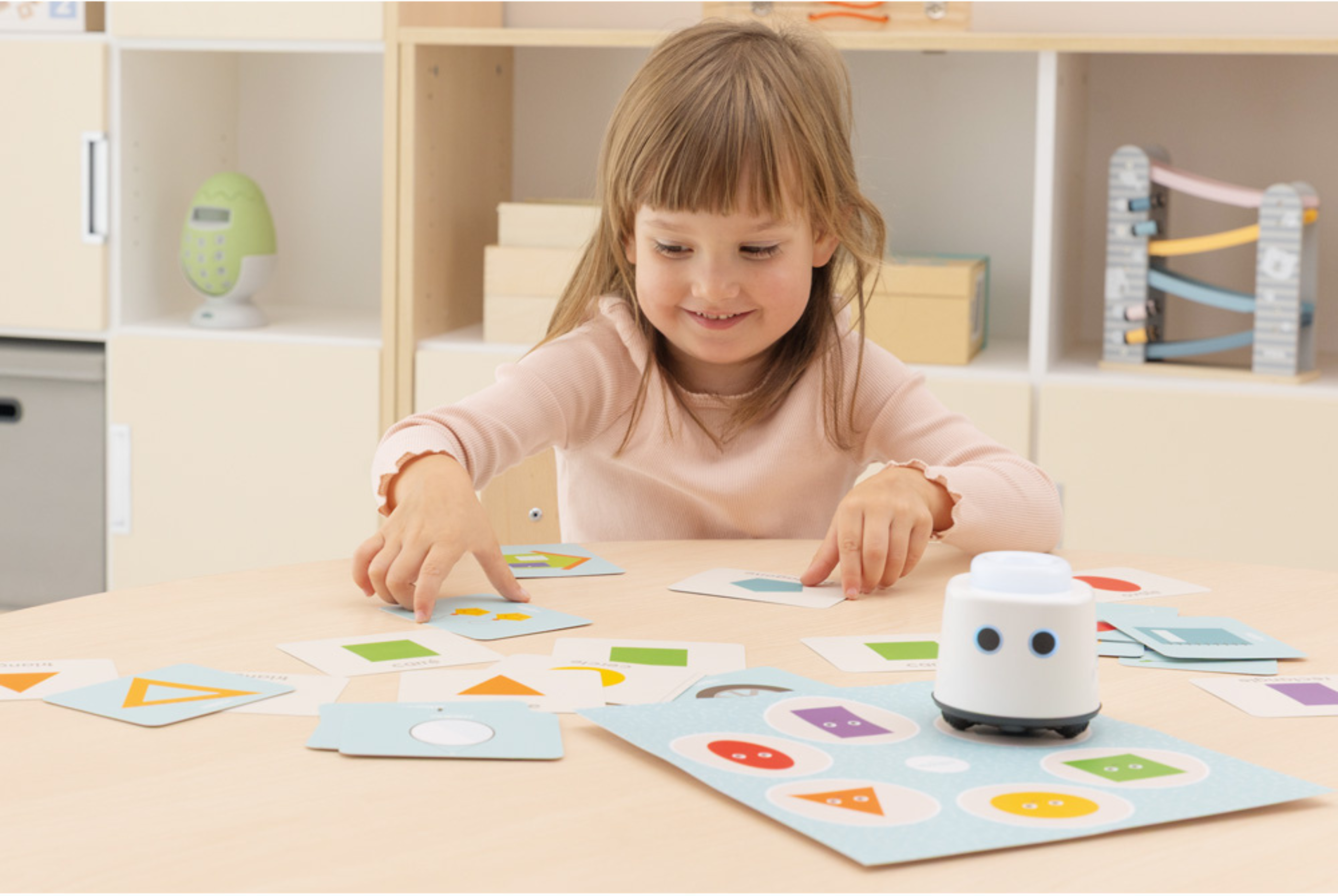 Interactive work with the cards and the robot encourages active learning: the child chooses a card, places it on the miniBot, hears the word in English, and can immediately repeat it and use it in play.