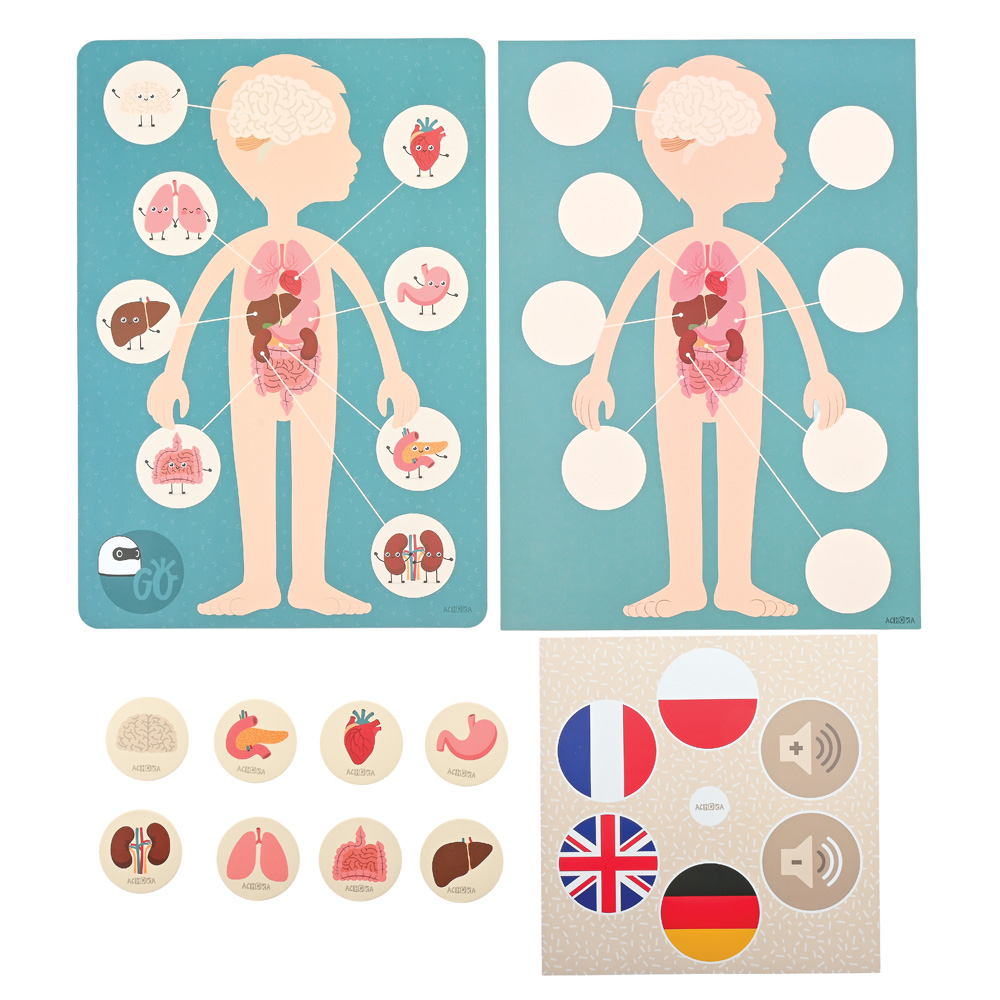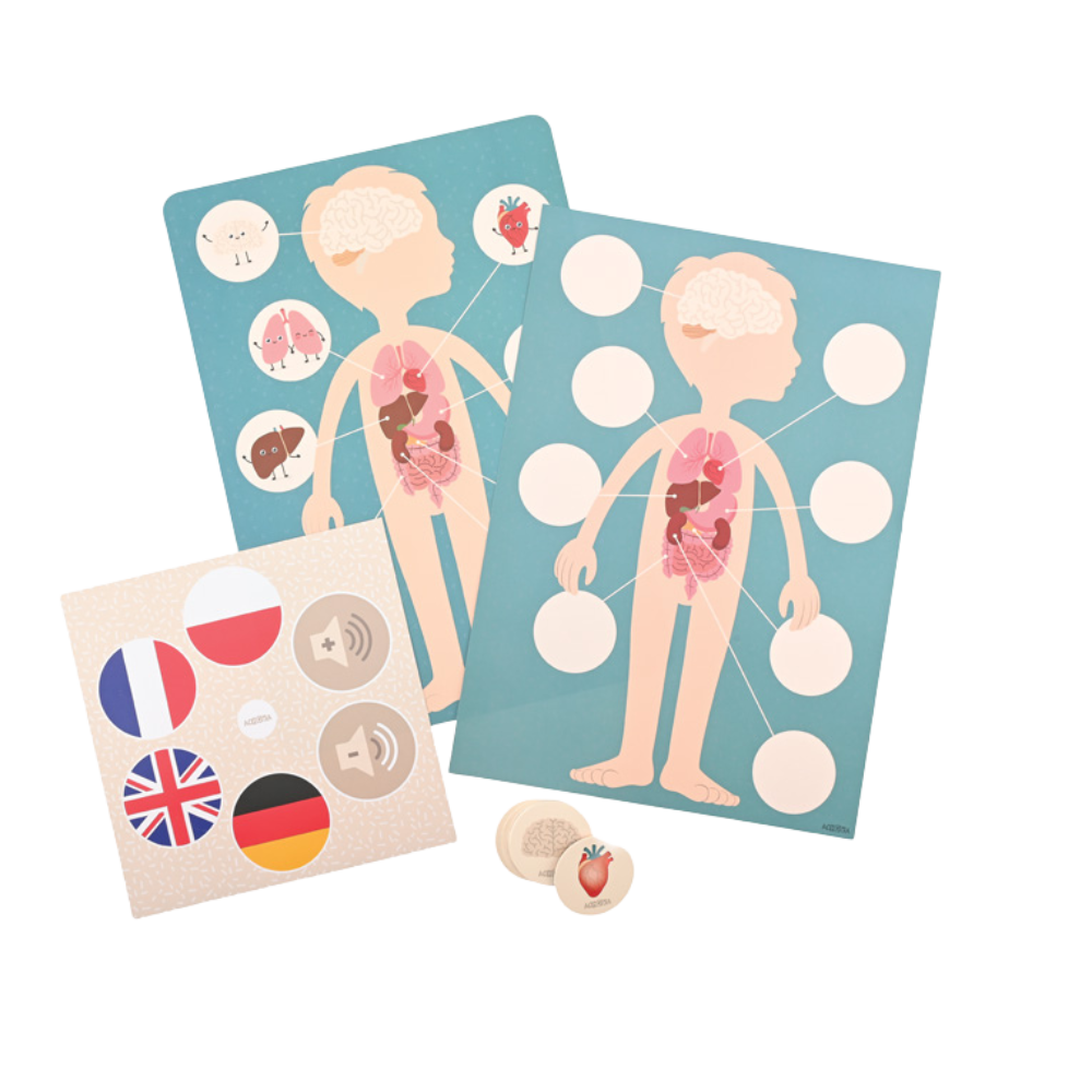 The board, educational cards, and audio recordings focus on the topic of human internal organs. This educational tool introduces children to the fascinating world of human anatomy.