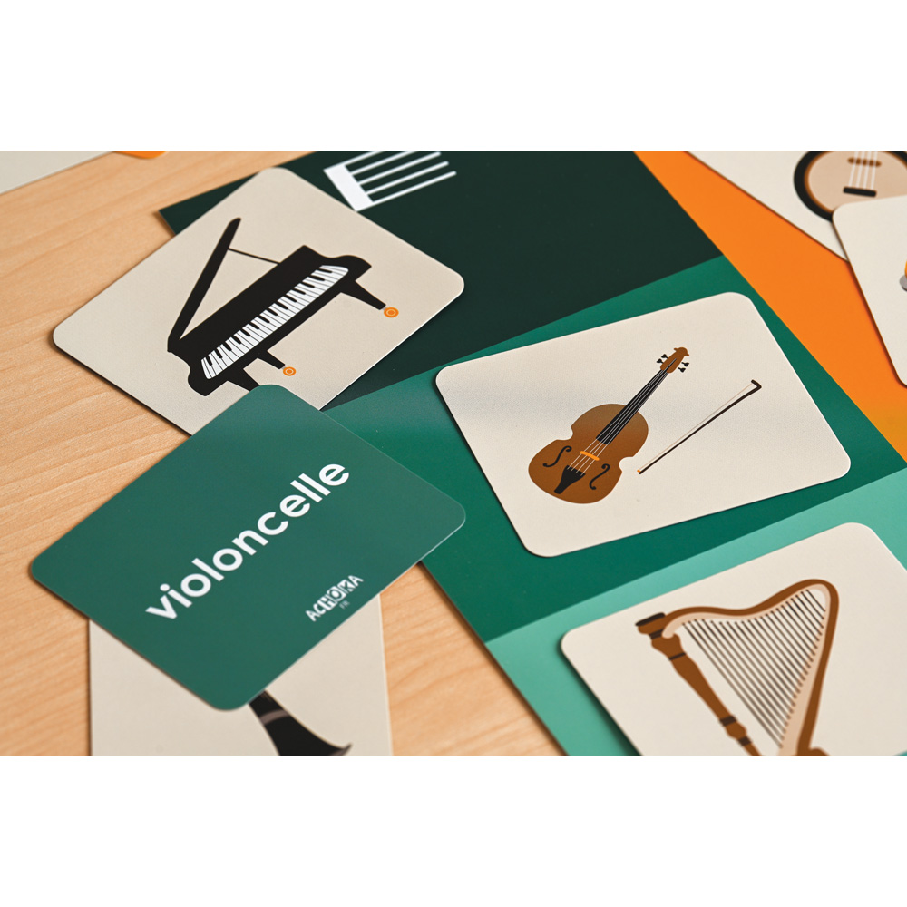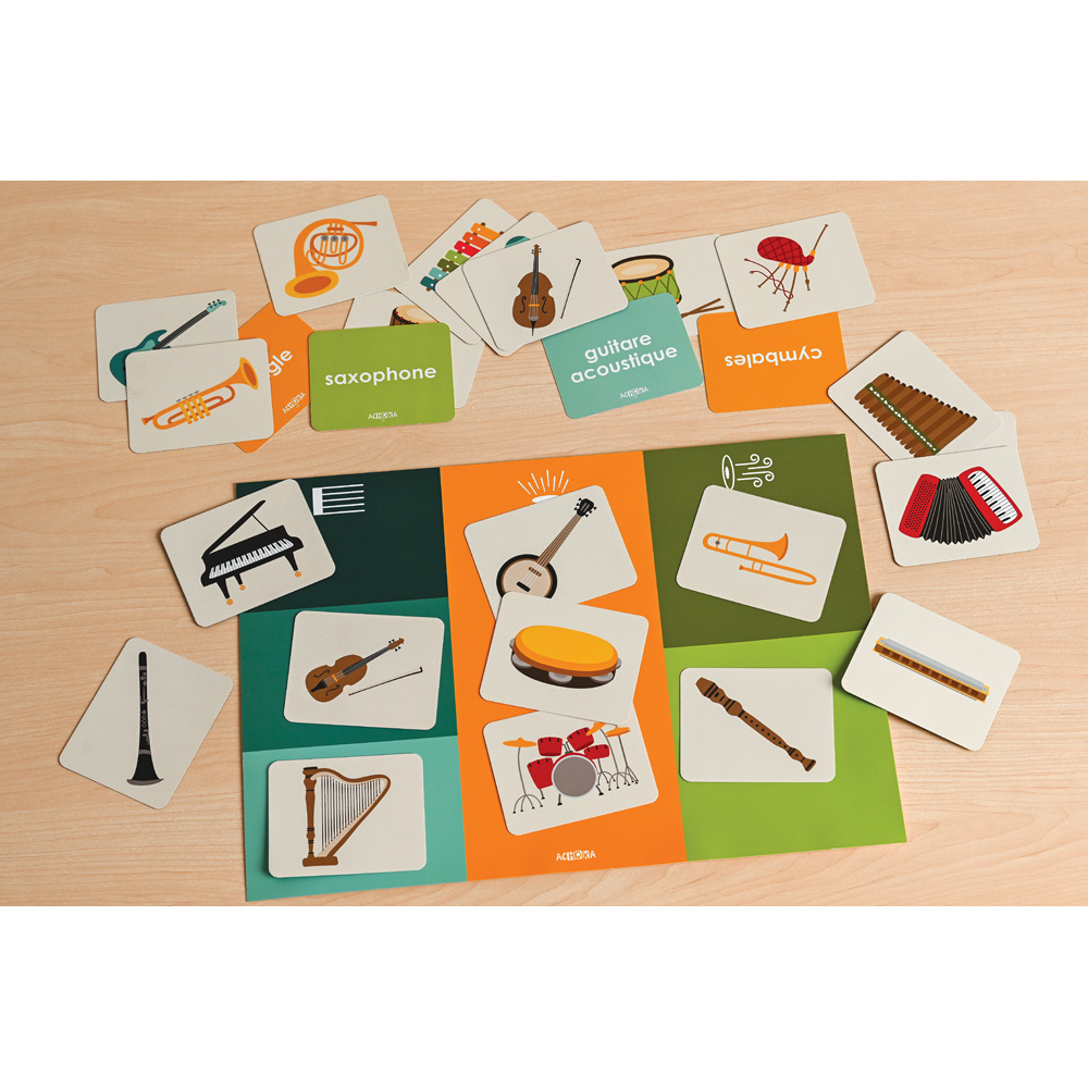 The set includes an educational A3 board, cards depicting instruments along with their names in French.