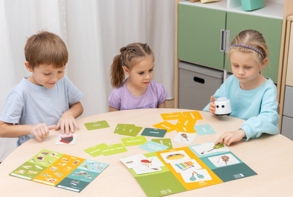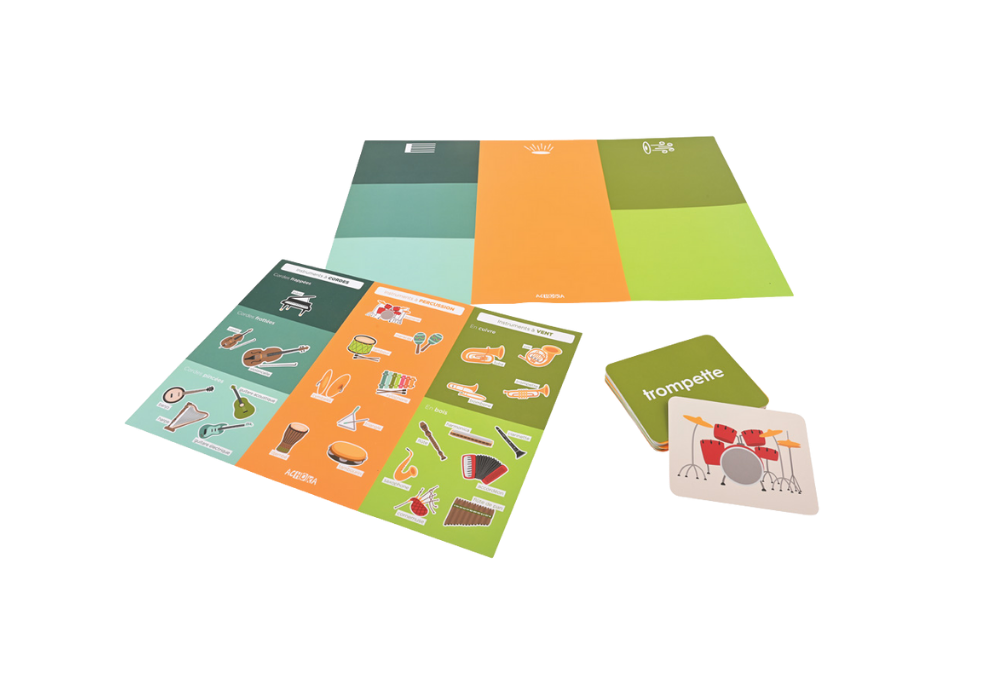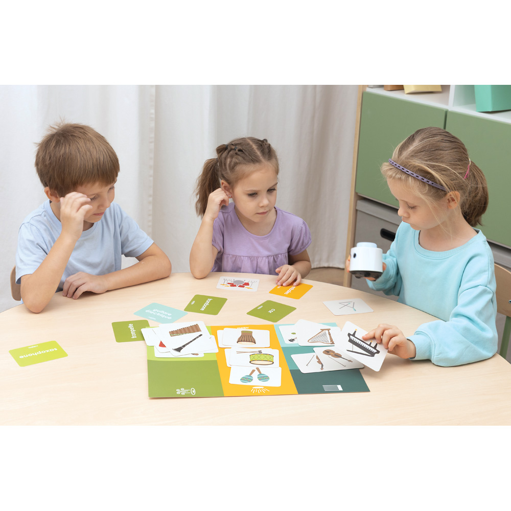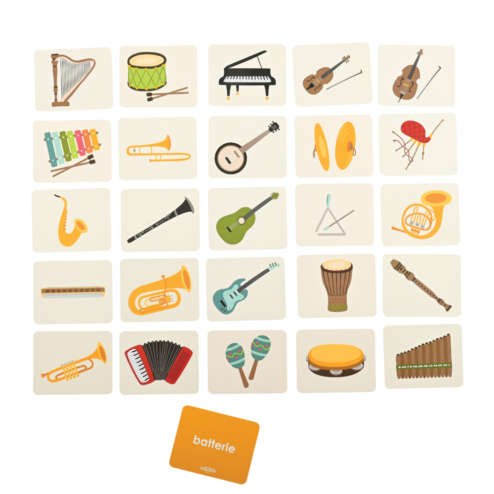 The set allows children to recognize instruments, name them, and practice the correct pronunciation of French words and sound-related concepts. By combining illustrations, audio recordings, and words, learning vocabulary becomes natural, engaging, and closely aligned with children’s curiosity.