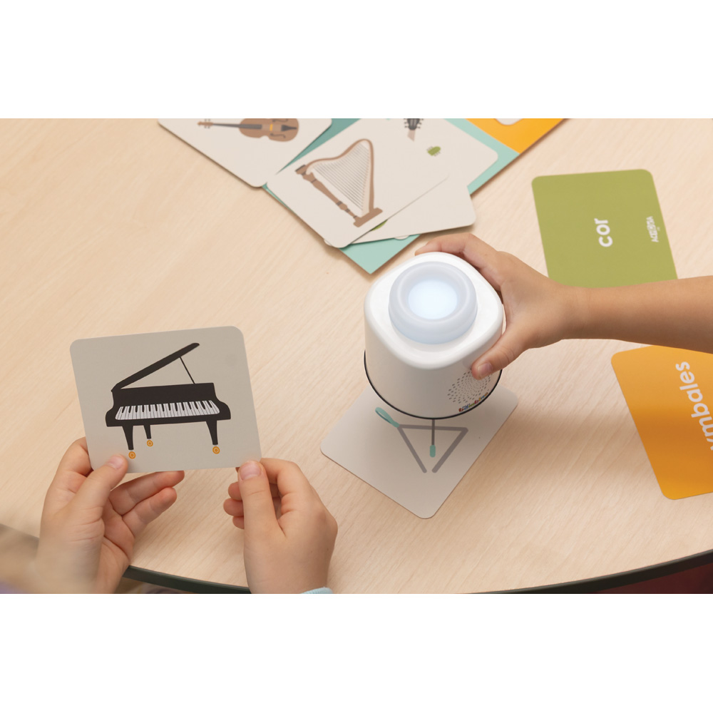 The tasks involve matching sounds to illustrations, naming instruments, repeating words, and independently checking answers – which enhances agency and encourages repeated attempts. The set works perfectly for language lessons (individual and group), music classes, and in the after-school club. The simple mechanism allows for immediate play without preparation, and repeating and correcting answers naturally reinforces new vocabulary.
