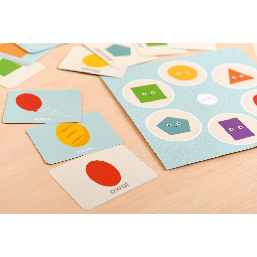 Zawartość zestawu: 26 kart z ilustracjami przedstawiającymi kształty i przedmioty z codziennego życia