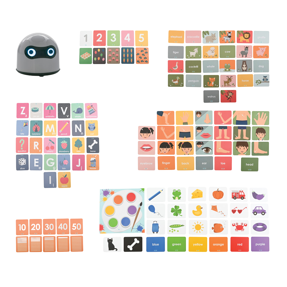 Zestaw zawiera mówiącego robota LOGI miniBot oraz zbiór tematycznych kart edukacyjnych. Dzięki innowacyjnej technologii, wystarczy przyłożyć kartę do robota, a LOGI miniBot rozpozna ją i odtworzy poprawną wymowę w języku angielskim. Dzieci uczą się nowych słów, kojarząc je z obrazkami, co pozwala im przyswajać język w naturalny sposób, bez potrzeby korzystania z ekranów.